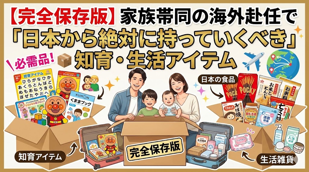 この記事では、家族帯同で海外赴任をする皆様に向けて、日本から「絶対に持っていくべき」子供向けの知育・生活アイテムを厳選して解説します。限られた引っ越し荷物の容量(船便・航空便・手荷物)を最大限に活かし、後悔のない海外生活のスタートを切るための【完全保存版】リストとしてご活用ください。