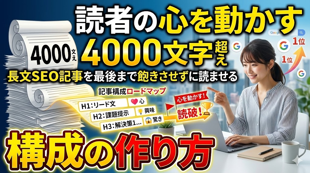 この記事では、読者の「読まない壁」を突破し、4000文字を超えるボリュームでも最後までスクロールする手が止まらなくなる、プロのSEOライターが実践する「長文構成のフレームワーク」と「視覚的な飽きを防ぐテクニック」を徹底解説します。この記事を読み終える頃には、あなたは「文字数を稼ぐ苦痛」から解放され、読者の心を動かす圧倒的な長文コンテンツを意図的に作り出せるようになっているはずです。