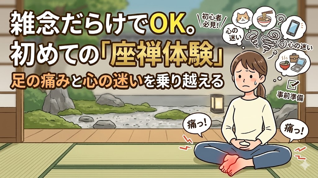 この記事では、初めて座禅体験に参加する方が抱える「雑念」と「足の痛み」への不安を徹底的に解消し、心からリラックスして座禅の時間を楽しむための事前準備と心構えを詳しく解説します。この記事を読めば、あなたはもう足の痺れや心の迷いを恐れることなく、清々しい気持ちでお寺の門をくぐることができるはずです。