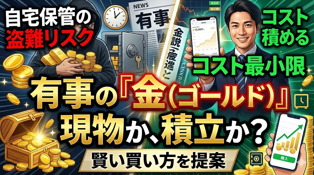 本記事では、「有事の金」を検討している方に向けて、現物購入に潜む恐ろしいコストと盗難のリアル、そしてリスクをゼロにして効率的に金を保有する「純金積立」や「金ETF」といった賢い代替手段を徹底的に解説します。この記事を読めば、あなたの資産規模と目的に合った、最も安全でコストパフォーマンスの高いゴールドの買い方が明確になるはずです。