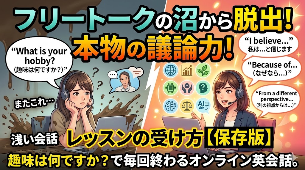このように、毎回同じようなトピックで浅い会話だけを繰り返し、英語力が一向に伸びない状態を「フリートークの沼」と呼びます。この沼にハマったまま何百回レッスンを受けても、ビジネスで意見を戦わせたり、深い議論(ディスカッション)をしたりする本物の英語力は絶対に身につきません。