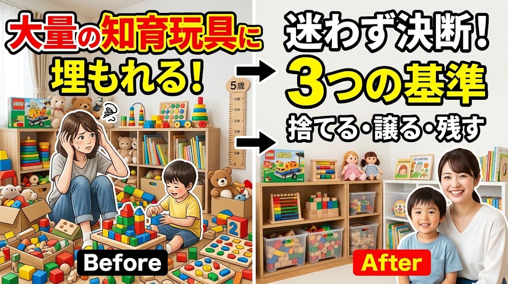 本記事では、部屋を圧迫する知育玩具の処分に悩む親御さんに向けて、知育玩具がなぜ捨てにくいのかという心理的メカニズムを紐解き、「捨てる・譲る・残す」を迷わずスパスパと決断できる「3つの絶対基準」を徹底解説します。この記事を読み終える頃には、罪悪感なくおもちゃを手放し、子供の「今」の成長に最も適したスッキリとしたプレイスペースを取り戻すことができるはずです。