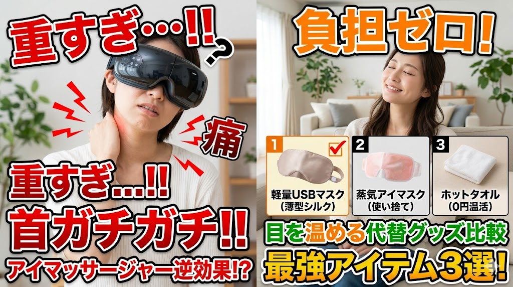 この記事では、アイマッサージャーがなぜ首への強烈な負担になってしまうのかという人間工学的な理由を解明し、手持ちの重いマッサージャーを首の負担ゼロで使うための「姿勢の裏技」を解説します。さらに、重たい家電を手放したい方に向けて、首や肩に一切負担をかけずに目を極上に温めてくれる「軽量&負担ゼロの代替グッズ」を徹底比較し、おすすめのアイテムを厳選してご紹介します。