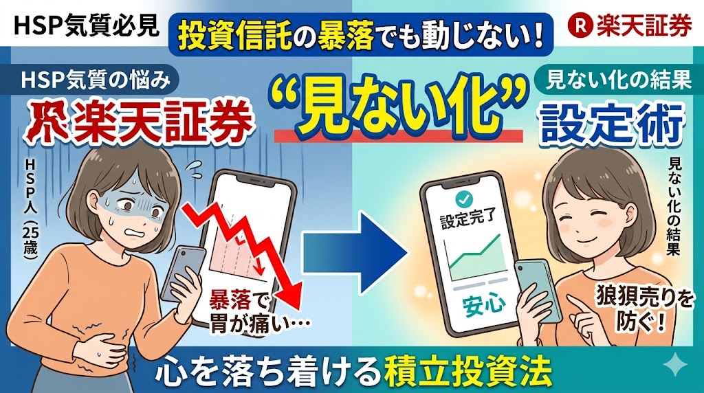 投資信託の暴落時に、不安で胃が痛くなってしまうHSP気質の方に向けて、楽天証券の「見ない化」設定術とメンタルコントロール法を解説しました。
