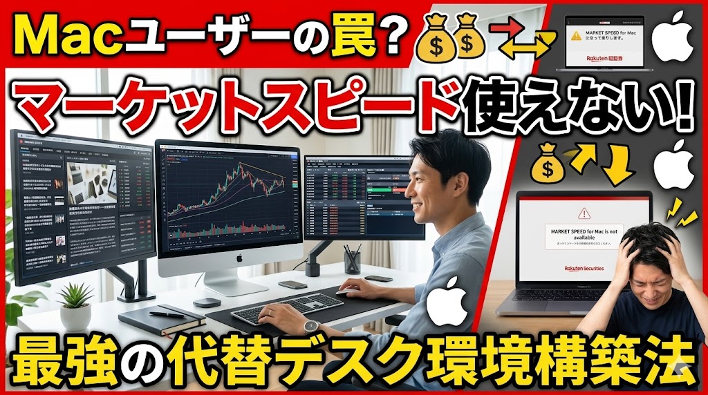 本記事では、マーケットスピード難民となってしまったMacユーザーに向けて、スマホアプリ「iSPEED」の裏ワザ的な活用法や、最新のMac(Appleシリコン)の機能をフル活用した「最強の代替デスク環境構築法」を徹底解説します。この記事を読めば、あなたのMacデスクが、情報処理能力とデザイン性を兼ね備えた最高のコックピットに生まれ変わるはずです。