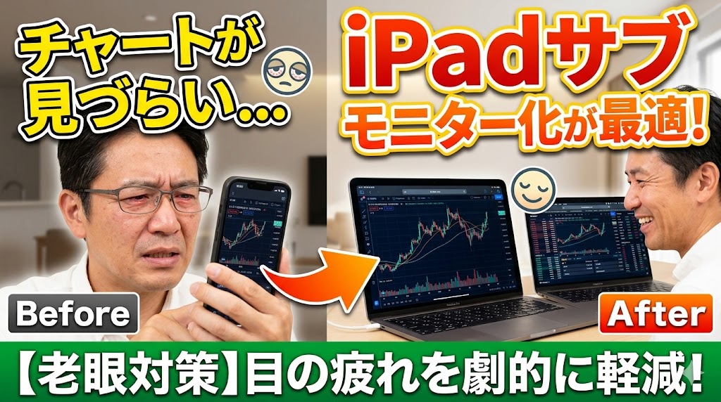 この記事では、老眼による視力変化が投資パフォーマンスに与える悪影響から、なぜPCモニターの増設ではなくiPadが最適解なのか、そして古いiPadや新しいiPadを「最強の投資用サブモニター」として活用するための具体的な設定方法までを、約5000字の特大ボリュームで徹底的に解説します。この記事を読めば、目を細めてスマホを遠ざけるストレスから解放され、再びクリアな視界と判断力を取り戻すことができるはずです。