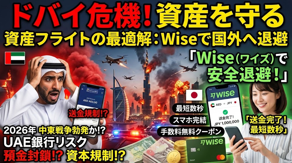この記事では、有事のカントリーリスクから大切な資産を守るため、Wise(ワイズ)を活用してUAEディルハム(AED)や米ドル(USD)を速やかに日本や他国の安全な口座へ移動させる「資産フライト」の最適解を解説します。