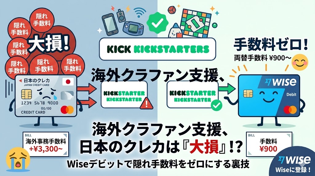 この手数料の罠を回避し、クラファンの支払いを最もお得にする最強の裏技が「Wise(ワイズ)デビットカード」の活用です。この記事では、KickstarterやIndiegogoで大損しないための外貨決済の仕組みと、Wiseを使って手数料を限りなくゼロに近づける方法を徹底解説します。