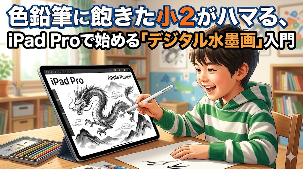 iPad Pro(楽天で探す)とApple Pencil(楽天で探す)という、大人が使うようなプロ仕様のテクノロジー。それを「水墨画」という最もアナログで原始的な表現に全振りする贅沢。この環境を用意できるのは、親だけです。