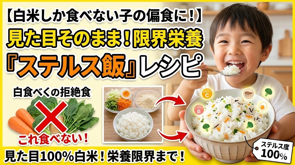 この記事では、「無理に野菜を食べさせる」という王道のアプローチを完全に捨てます。その代わりに、お子様が唯一安心して食べられる「真っ白な白米」の見た目と食感を1ミリも変えることなく、親の執念でタンパク質・ミネラル・ビタミンを限界まで叩き込む『究極のステルス飯(隠密栄養補給)』の技術を徹底解説します。